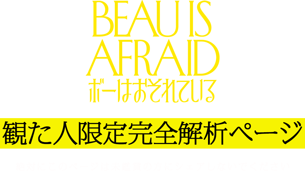 長編監督3作目にして約3時間の自己最長映画を生み出したアリ・アスター。今回はオスカー俳優ホアキン・フェニックス主演のフロイト的でピカレスクな旅を描いたブラックコメディである。過去2作とは異なりホラー的な要素は薄いかもしれないが、主人公ボーがワイルドかつサイケデリックな旅路で直面する数々の出来事は恐怖(ホラー)でしかない。最愛の母親との再会も含めて。アリ・アスターのキャリア史上最も野心的な、壮大な悪夢の悲喜劇オデッセイ。シュールで不条理な地獄ロードを突き進むボーの姿にあなたはなにを見るか? それでは旅のお供に、恒例の徹底解析をお楽しみください。