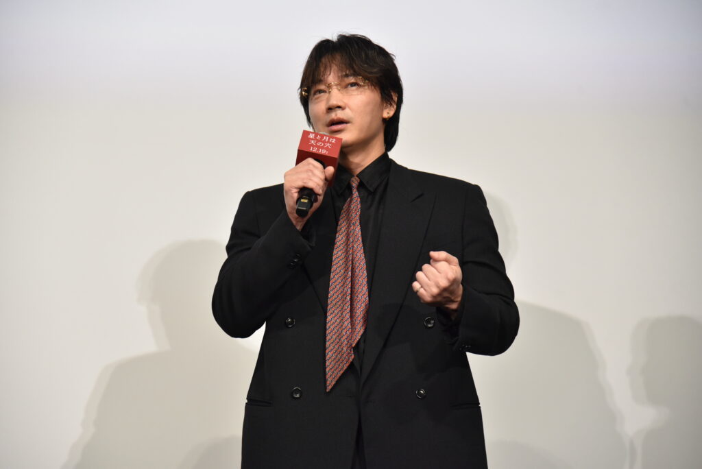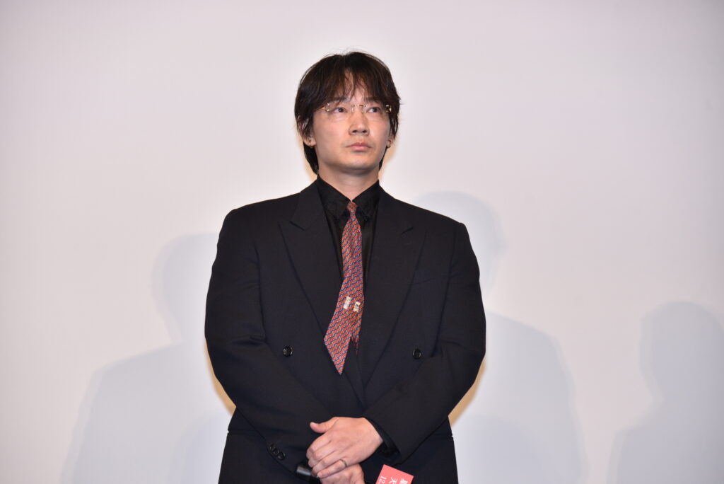 「率直に今日という日を迎えられて嬉しいです。映画はいろんな見方があると思いますが、この作品は“目で見る”というより、“耳で見る映画”であり“読む映画”とも言えると感じています。“珍味”な作品だと思うので、ぜひ味わって見てほしいです。僕自身、試写で見た時に、現場では感じられなかった味わいをたくさん感じました。咲耶さん、田中麗奈さん、岬(あかり)さんが演じられた 3 人の女性の在り方がとても豊かで、いまの時代にこの作品が出ていく理由というところで、『強いメッセージを込めた』というよりは、言葉の美しさや滑稽さ――小説家であり、言葉を生業にしている矢添という男から放たれる言葉がどこかおかしく、ある種、いまの時代でいうところの“化石男”と言える男なので、そういう部分を楽しんでいただけたらと思います」と本作への思いを静かに、しかし熱く語る。