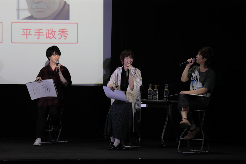 信長と恒興の主従関係が本作のポイントでもあるということで、一問目は「上司にするなら誰??」という質問に。回答タイムでは一番に立花さんが回答。自身の演じる「沢彦宗恩」を挙げ、「常に優しくサポートしてくれる。裏で悪いこともしてくれて成功に導いてくれますからね(笑)」と裏のありそうな見た目を話し、笑いを誘っていました。